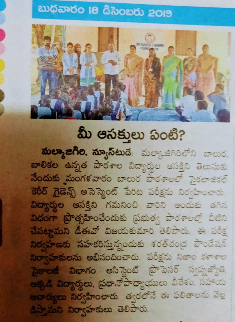 Conducted 3 day workshop on Career Guidance programme along with counselling sessions in association with Psychology Department, Nizam College for class 10th students ZPHS(Boys) & ZPHS(Girls), Malkajgiri, Hyd.,